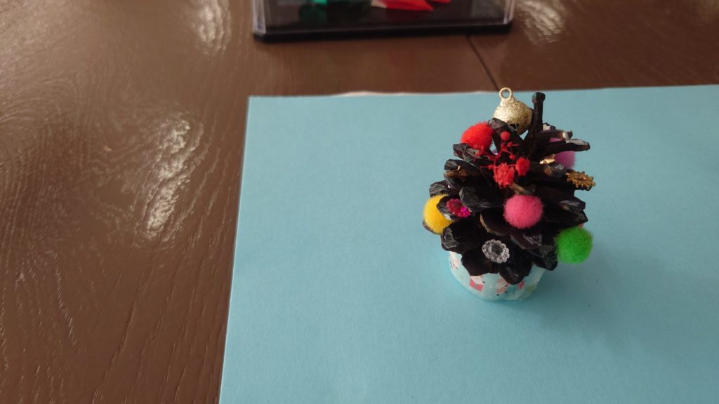 こちらは松ぼっくりをクリスマスツリーのように飾ってある作品です。